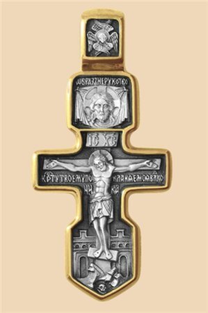 Распятие. Серафим Саровский - это ювелирный крестик, имеющий четырёхконечную форму, расширяется в верхней и нижней его части благодаря вертикальной балке и имитирует вид восьмиконечного креста. С верхней стороны балки её конец как бы создаёт форму квадрата, а в его нижней части имеет заострённый вид и тем самым преподносится в виде духовного меча. Такое оформление креста начало встречаться в России с конца четырнадцатого столетия, достигает своей популярности в шестнадцатом и было широко распространёно во все последующие века.